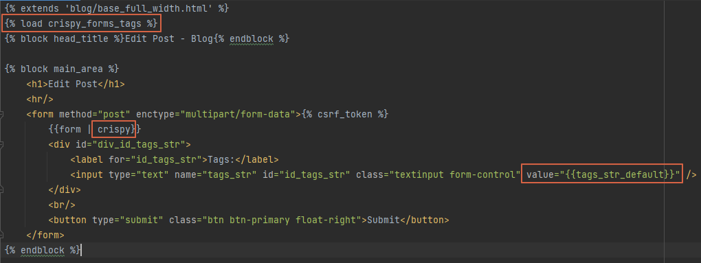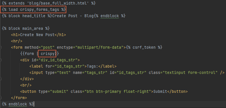 crispy-forms를 적용할 수 있도록 맨 위에 {% load crispy_forms_tags %}를 추가하고 폼이 테이블 형태로 나타나지 않도록 {{ form }}에 | crispy를 추가합니다.
