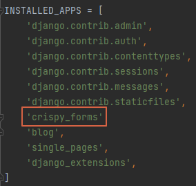 설치 완료 후 settings.py 파일의 INSTALLED_APP에 crispy_forms를 추가하고 crispy_forms의 스타일을 bootstrap4로 하겠다고 지정합니다.
