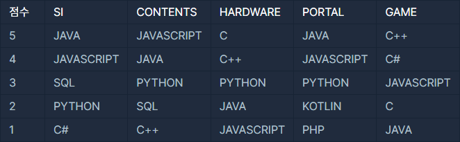 예를 들면, SQL의 SI 직업군 언어 점수는 3점이지만 CONTENTS 직업군 언어 점수는 2점입니다. SQL의 HARDWARE, PORTAL, GAME 직업군 언어 점수는 0점입니다.