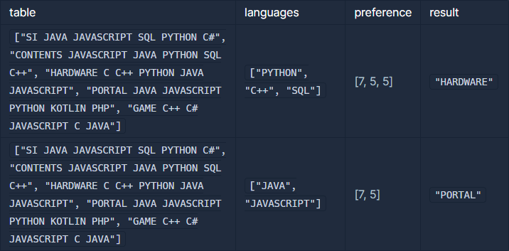 - languages의 원소는 "JAVA", "JAVASCRIPT", "C", "C++" ,"C#" , "SQL", "PYTHON", "KOTLIN", "PHP" 중 한 개 이상으로 이루어져 있습니다.
